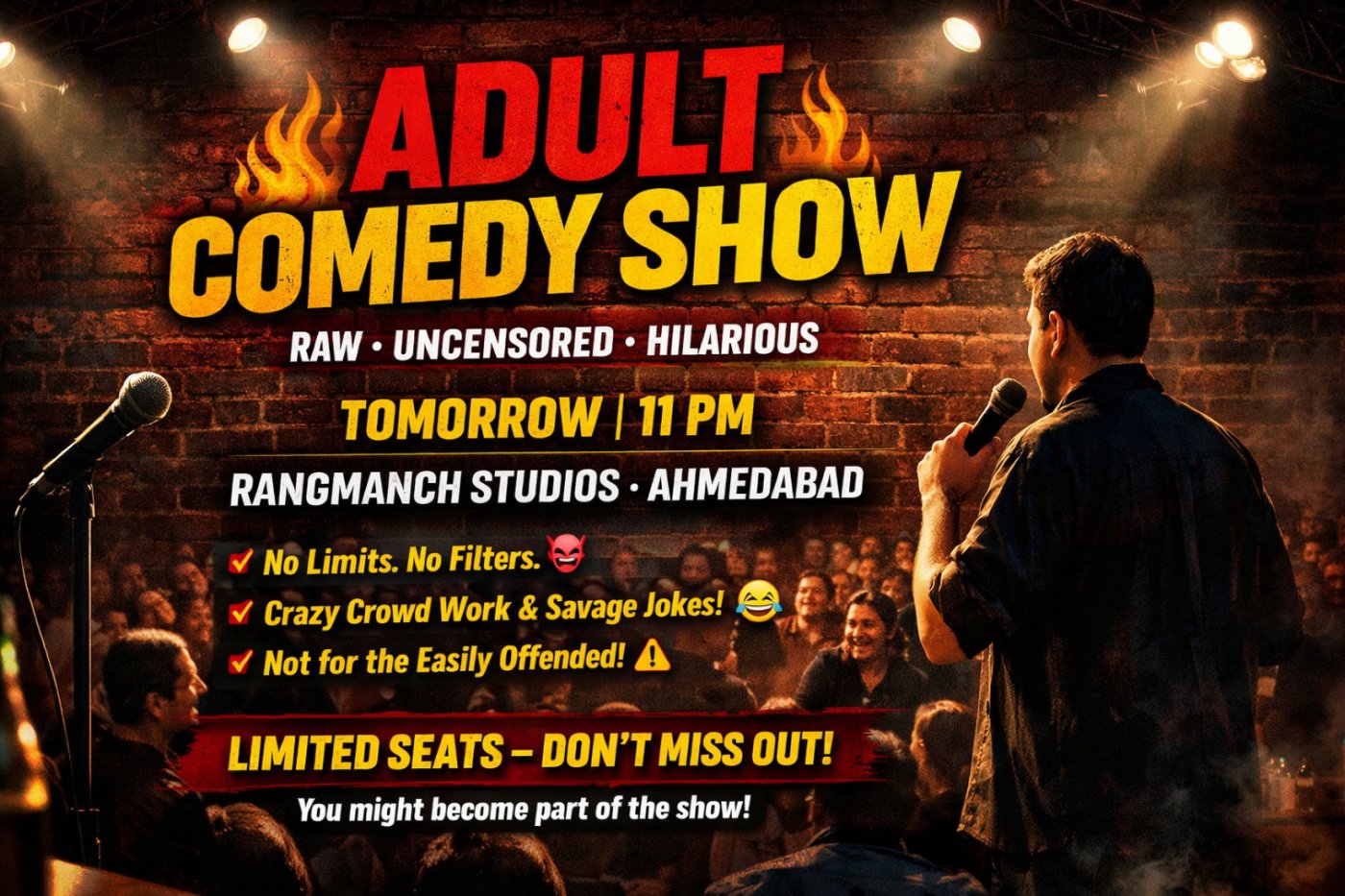 Ahmedabad, get ready for a night of raw, unfiltered, and absolutely savage stand-up comedy. This is not your regular clean show β itβs bold, edgy, and strictly for those who like their humor with no limits.