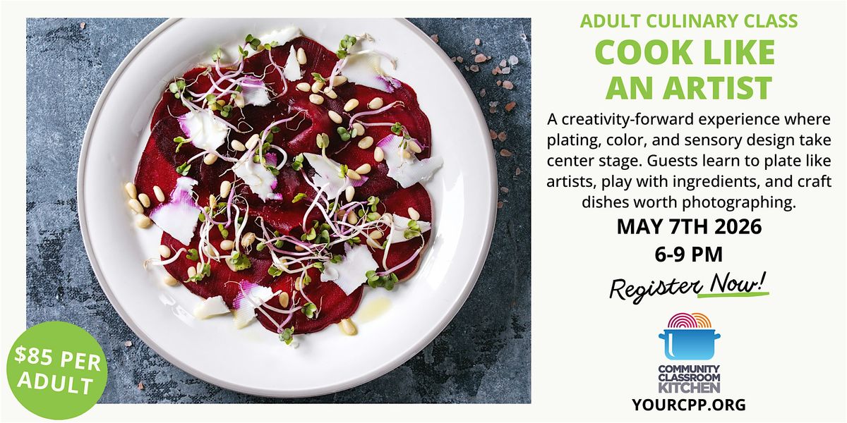In this hands-on adult culinary workshop, guests will craft three visually stunning, flavor-forward dishes while learning plating, color theory, and texture techniques. Create a rainbow beet carpaccio with whipped goat cheese, seared salmon (or crispy tofu for those who don’t eat meat) with a citrus brushstroke sauce, and a deconstructed berry shortcake palette plate, all designed to be as photogenic as they are delicious.