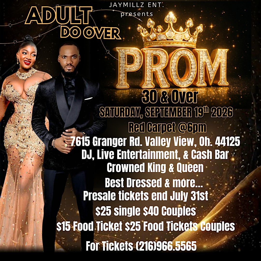 Adult Do-Over Prom: Because we deserve a Re-Run. For the 30-and-over crowd who wanna dress up, show out, & vibe all night. We're bringing you an R&B soaked evening with live entertainment, a Dj spinning your favorites, good food, big laughs, and prizes that'll make you feel like it's pay day.