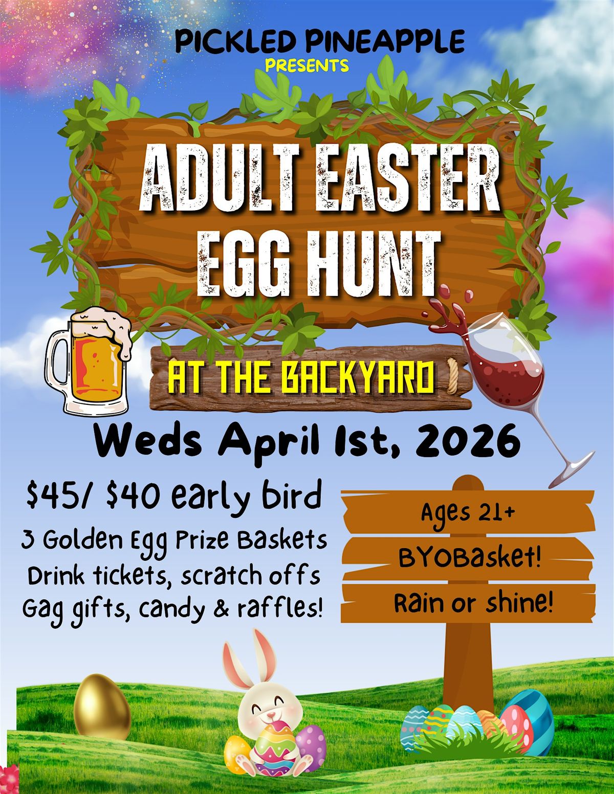 3 Golden Eggs Prize Baskets, door prizes and game, egg hunt filled with gag gifts, candy, drink tickets, gift cards and more! Food specials!