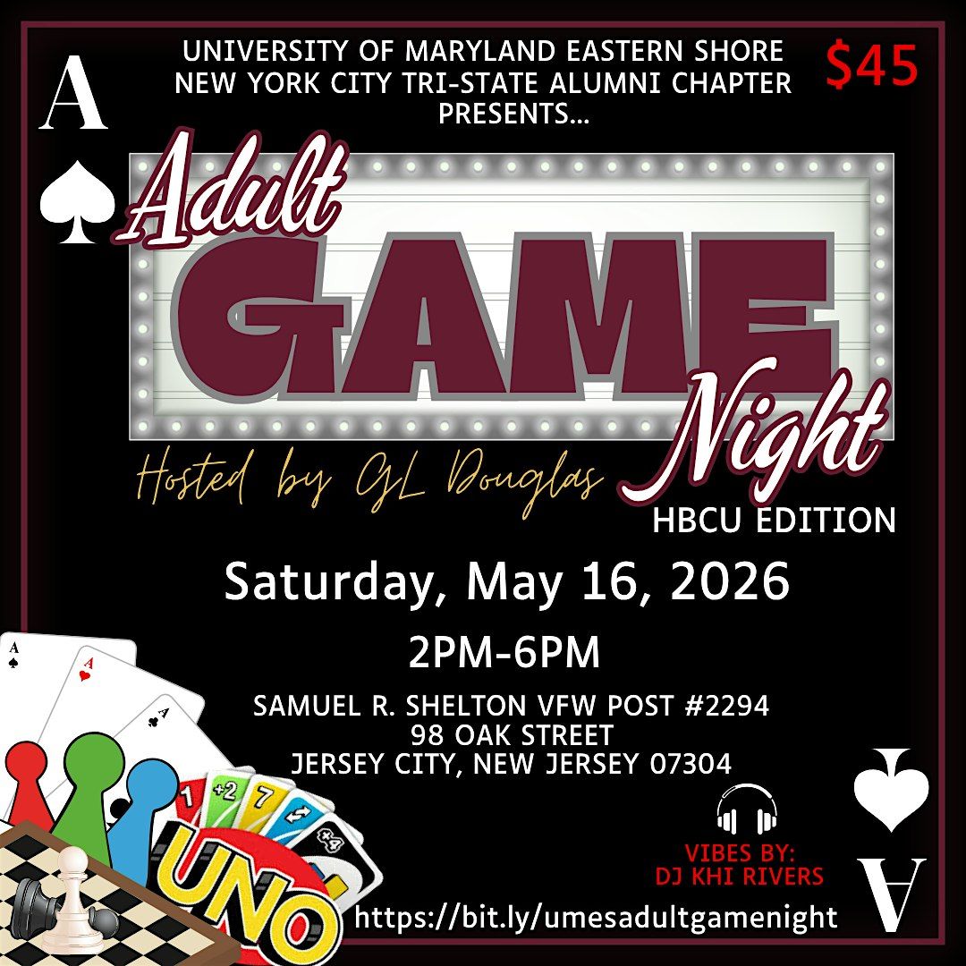 Come enjoy an exciting Game Night with the University of Maryland Eastern Shore NYC Tri-State Alumni Chapter, which aims to unite alumni for bonding, friendly competition, and a worthy cause. Alumni and supporters can reconnect, meet new people, and support the chapter's ongoing initiatives at this unique event, which doubles as a fundraiser and membership mixer.