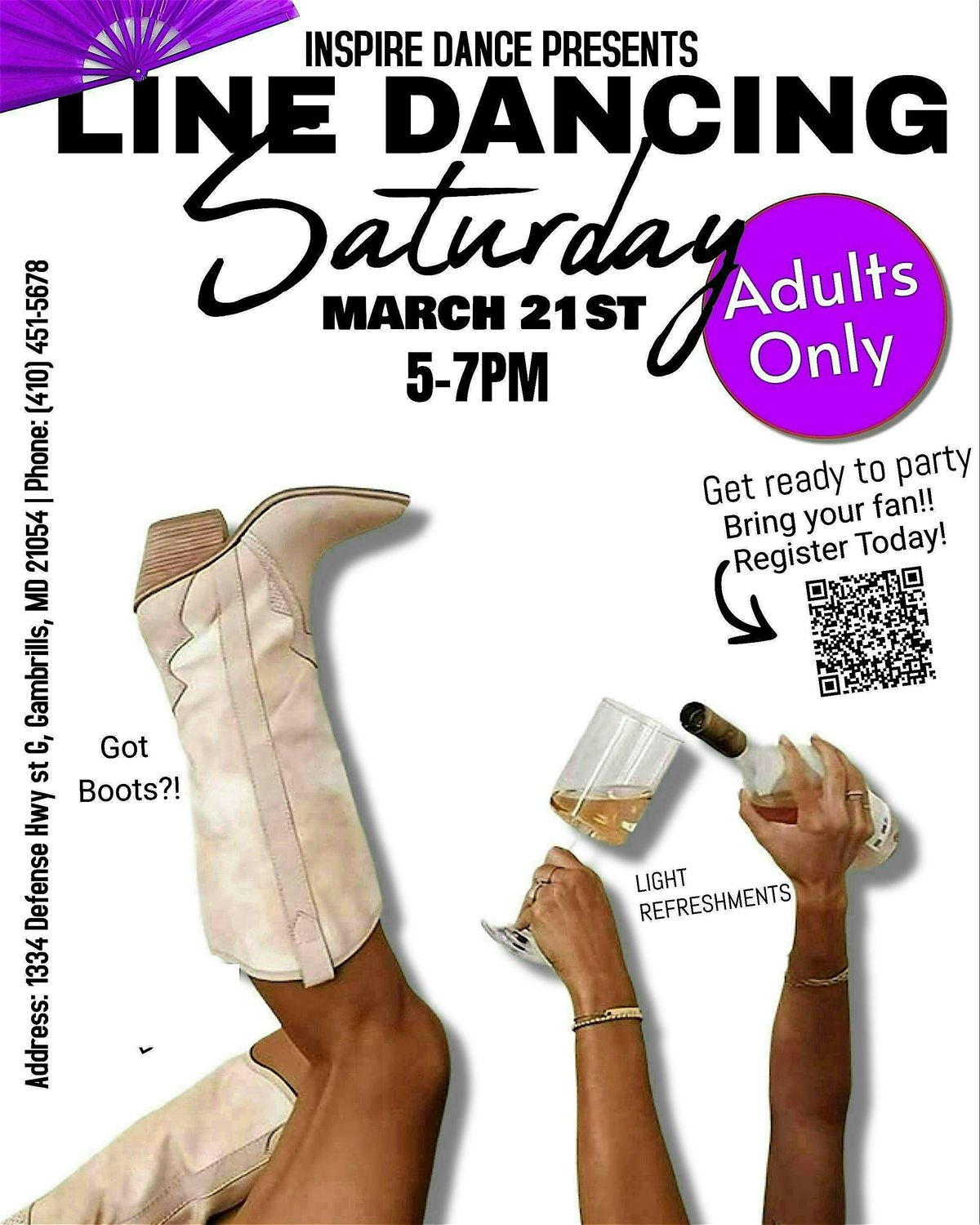 Come join us for a fun and energetic line dance class for adults! Whether you're a beginner or have some experience, this class is perfect for anyone looking to learn new moves and meet new people. No partner required - just bring your dancing shoes and get ready to groove! The class will be held at 1334 Defense Hwy, so mark your calendars and don't miss out on the chance to dance the night away! Light refreshments will be served! NO KIDS ALLOWED!!