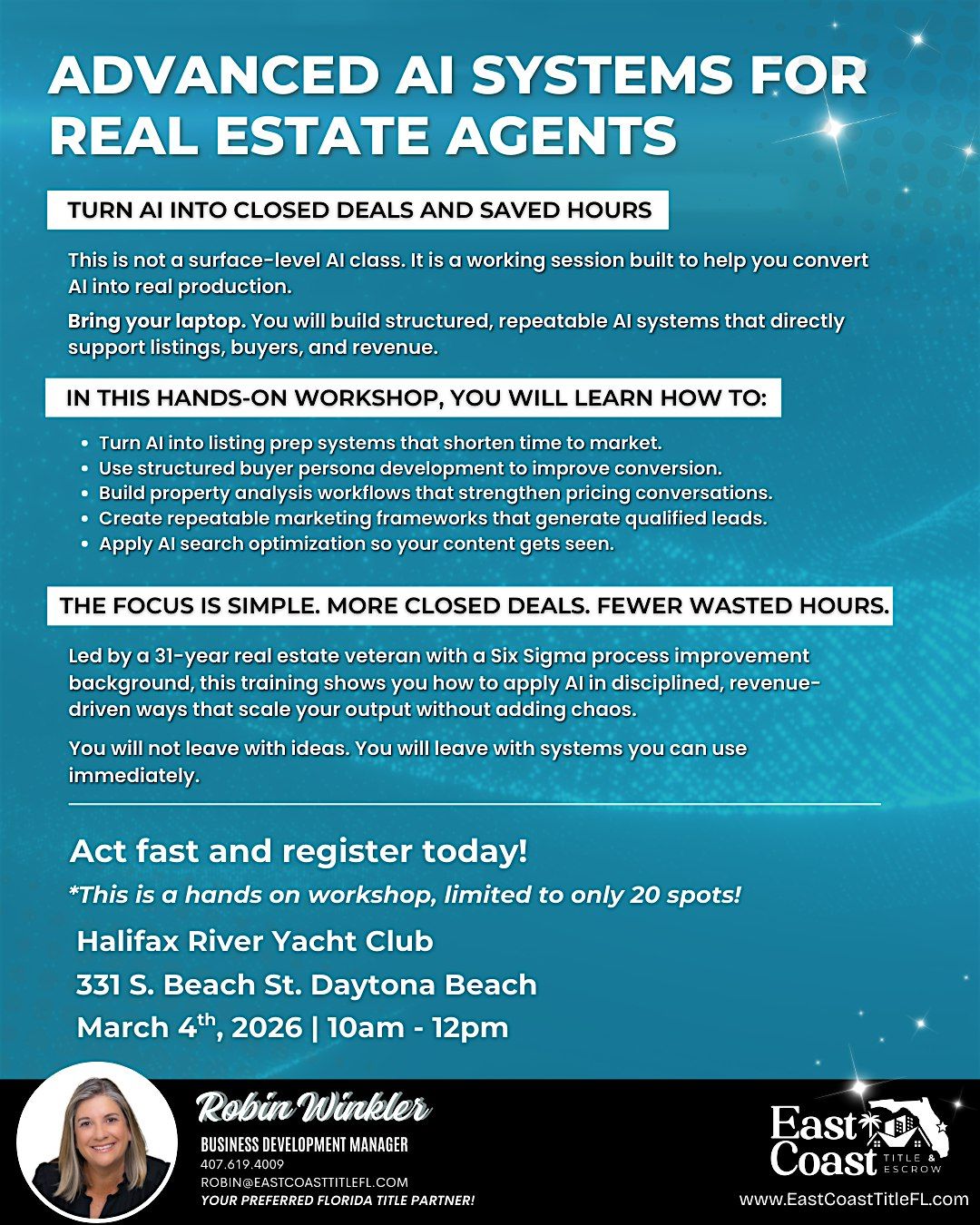 Ready to turn AI into closed deals and save hours every week? Join our hands-on AI workshop for real estate agents on March 4, 2026 (10amβ12pm) at Halifax River Yacht Club, Daytona Beach.