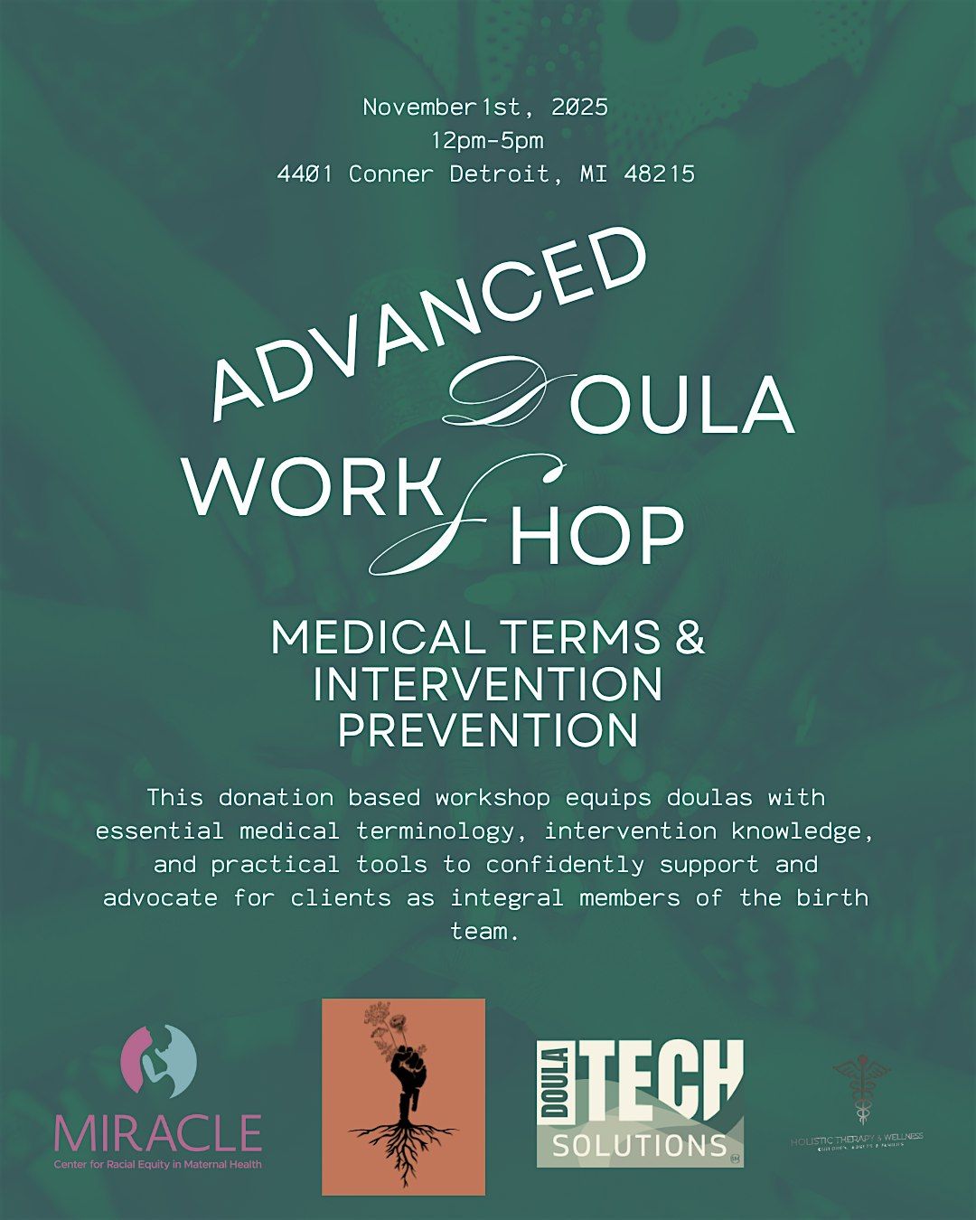 Join us for an informative workshop focusing on medical terms and interventions with midwives, therapists, OBGYN's and more. This in-person event will take place at 4401 Conner St, where experienced practitioners will guide you through understanding and navigating complex medical terminology and procedures to better advocate and educate your clients. Whether you're a seasoned doula looking to expand your knowledge or just starting out in the field, this workshop is designed to enhance your skills and confidence in supporting birthing individuals. Don't miss this valuable opportunity to deepen your expertise!