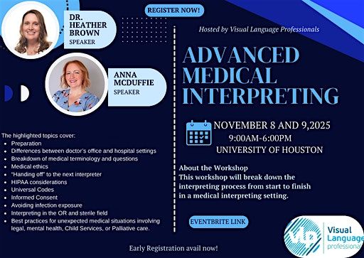 Highlighted topics include: preparation, doctor's office vs. hospital setting, breaking down terminology and medical questions, medical ethics, the art of "handing off" to the next interpreter, HIPPA considerations, Universal Codes, Informed Consent, avoiding infection exposure, interpreting in the OR, sterile field, best practices when medical situations are not what is expected involving legal, mental health, child services, or palliative care.