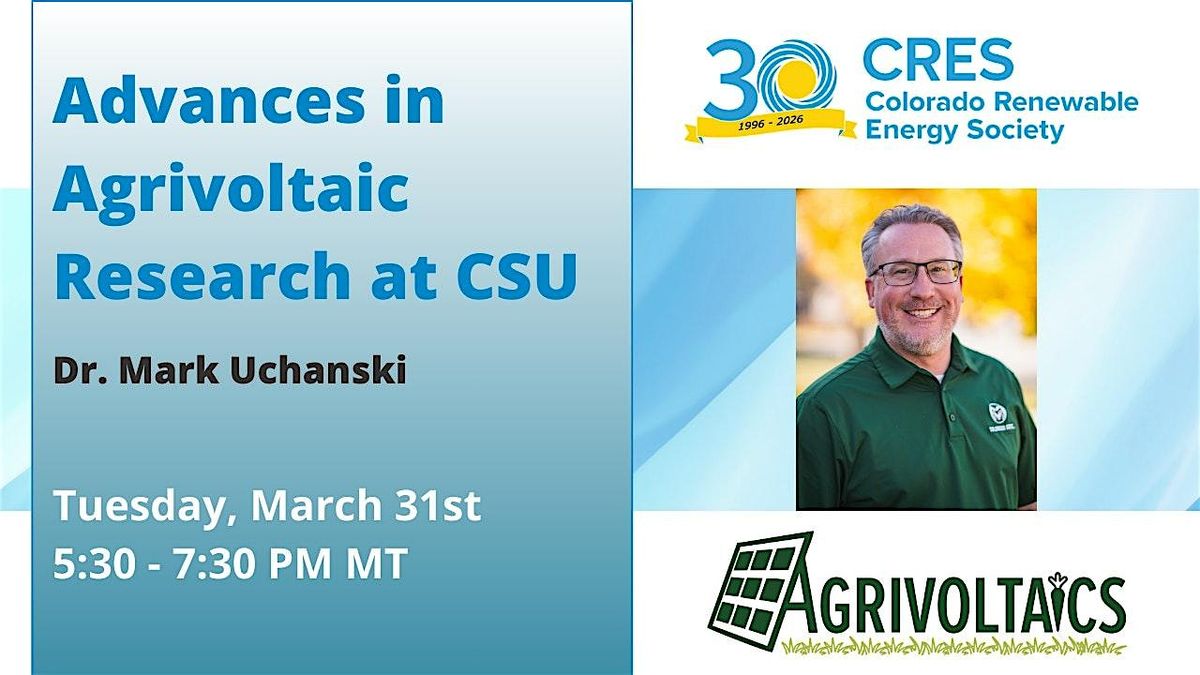 Join us at Odell Brewing to learn more about the foundational agrivoltaics research being conducted at Colorado State University and how it can help agricultural producers in Colorado and the Mountain West. Mark Uchanski is an associate professor of horticulture at Colorado State University. He manages the CSU Agrivoltaics Testing Grounds at the ARDEC research farm in Fort Collins, Colorado. The first Agrivoltaics Testing Grounds array was installed in 2019 and includes semi-transparent modules to evaluate the balance of crop production and electrical output on an operational farm. In 2024, the Testing Grounds were expanded to include three rows of vertical bifacial modules. This is a first in Colorado and our region. Today, Mark will describe those projects as well as the rest of the growing CSU agrivoltaics portfolio.
