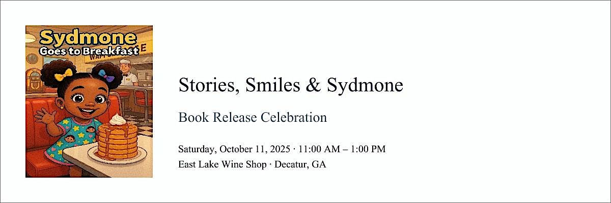 Welcome to the book release and signing event for Adventures of Sydmone! Join us at East Lake Wine Shop on October 11, 2025 at 11:00 AM (Eastern Time) to celebrate this exciting occasion. Meet the author, get your copy signed, and enjoy a day filled with literary fun. Don't miss out on this opportunity to immerse yourself in the world of Sydmone. See you there!