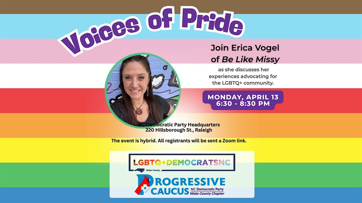 The LGBTQ+ Democrats and the Progressive Democrats of Wake County for a discussion about LGBTQ+ advocacy. Erica Vogel, owner of Be Like Missy, will be speaking on her experience calling out transphobia after a local controversy. There will be a discussion after the event.