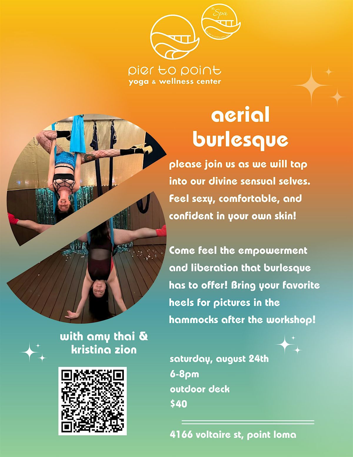 Our workshop is all inclusive- all levels, genders, and sizes are welcome! No dance or aerial experience necessary. Come feel the empowerment and liberation that burlesque has to offer! Bring your favorite heels for pictures in the hammocks after the workshop!
