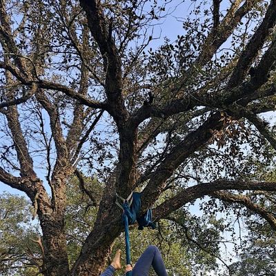 Aerial yoga class on the beach. All levels