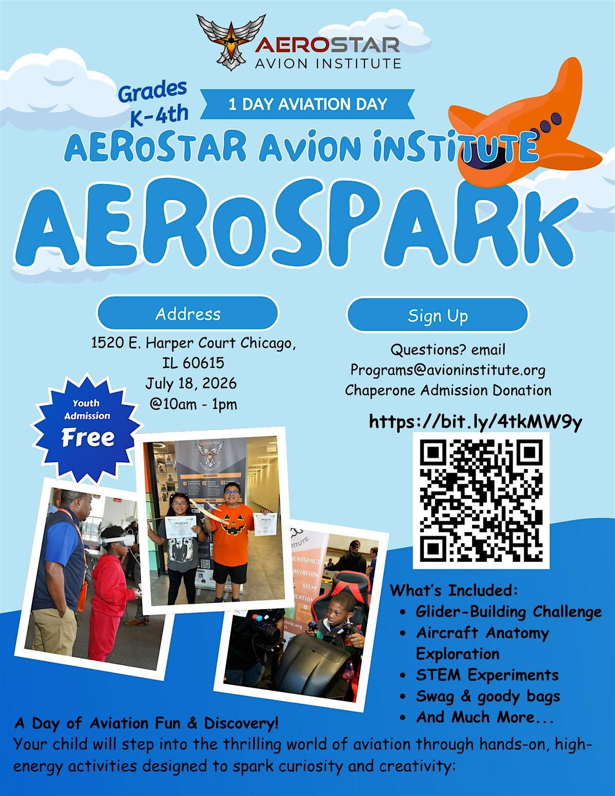 AeroSparks will meet on Saturday, July 18th, from 10 AM to 1 PM at Olive Harvey College. Parents are required to attend with their children. Snacks and drinks will be provided to keep everyone energized.
