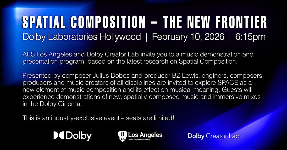 Audio engineers, producers, composers, songwriters and music creators of all disciplines are encouraged to join us to network, explore SPACE as an element of music composition, and experience demonstrations of new, spatially-composed music & immersive mixes in the Dolby Cinema.
