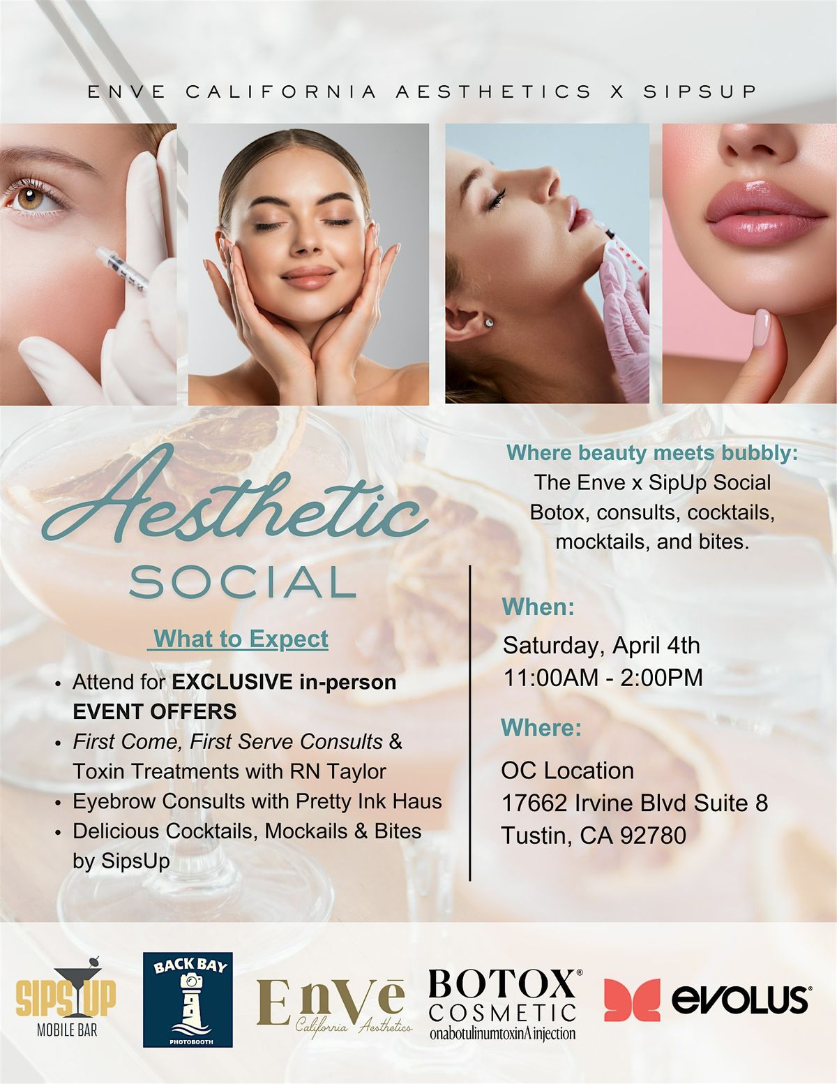 Join us in person for a fun and fabulous afternoon all about botox, beauty, and of course, tasty beverages! It's the perfect chance to mix, mingle, and sip while exploring the latest in beauty trends with Enve and SipUp. Don't miss out on this chill social event where good vibes and great company flow effortlessly.