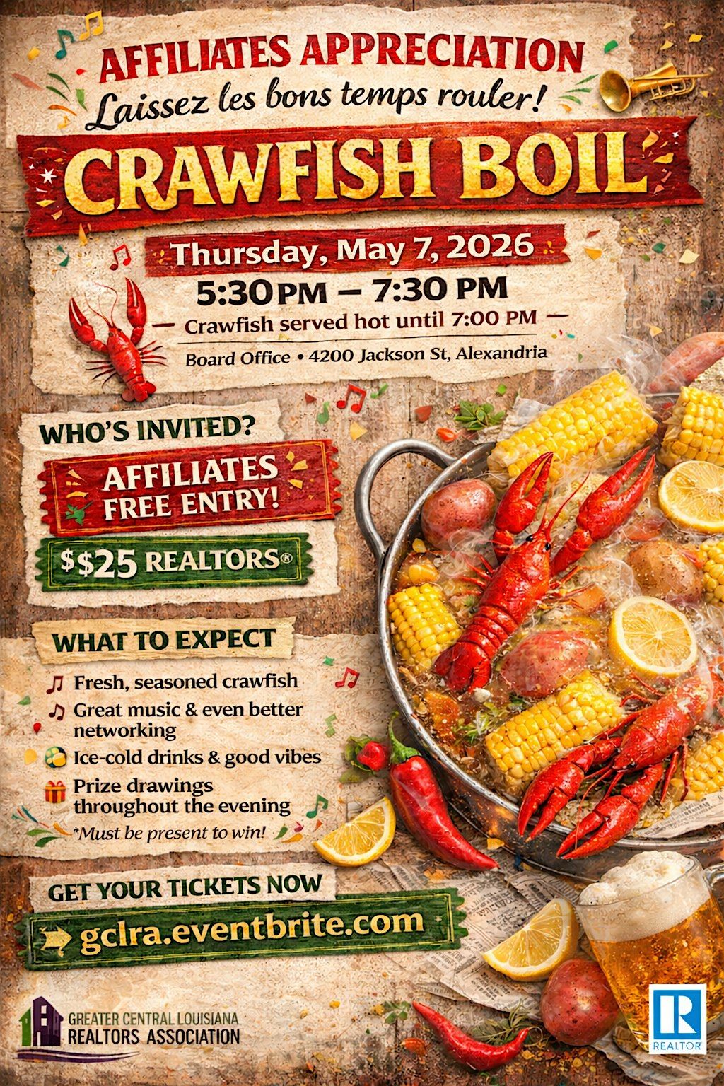 Join us at the Greater Central Louisiana REALTORS® Association for a fun and laid-back evening! We’re celebrating our awesome affiliates with a delicious crawfish boil, great company, and plenty of good vibes. Mark your calendar for May 7, 2026 at 5:30 PM (Central Time) and come hungry. It’s the perfect chance to relax, mingle, and enjoy some tasty crawfish together. Don’t miss out!