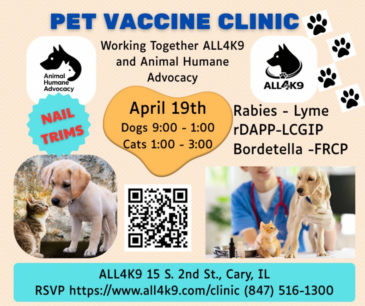 Next Affordable Vaccine Clinic taking place in Cary, IL. April 19th. RSVP only. Limited Slots available. Reserve at https://www.all4k9.com/clinic / (847) 516-1300. Location: ALL4K9 15 S. 2nd St., Cary, IL.