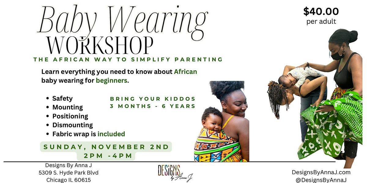 Welcome to the African Baby Wearing Workshop hosted by Anna J! Join us for an afternoon of learning and bonding with your little one. This in-person event will take place on Sunday, November 2nd, 2025 at 1:00pm in our cozy storefront.