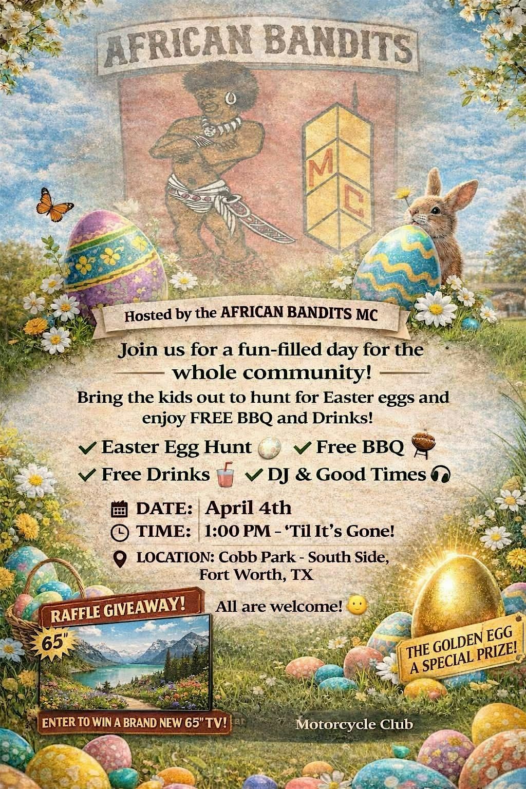 Get ready for some fun and excitement with the African Bandits! This in-person event is all about good vibes, great company, and hunting down those colorful eggs. Meet your local motorcycle club and share the same passion of bringing the community together. Bring your friends and family for a day full of laughs, surprises, and community spirit. Don’t miss out on this awesome way to celebrate, network and connect!