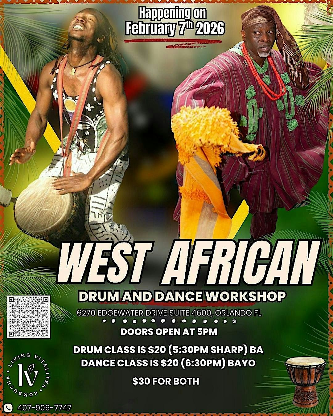 Drum instructor is Saturnin Ba. His friends call him Ba. Ba is a professional dancer and drummer from the Ivory Coast. He is a master of the Zaouli mask dance and trained in many other traditional dances. He is an amazing Djembe and dundun player and is sure to challenge you.