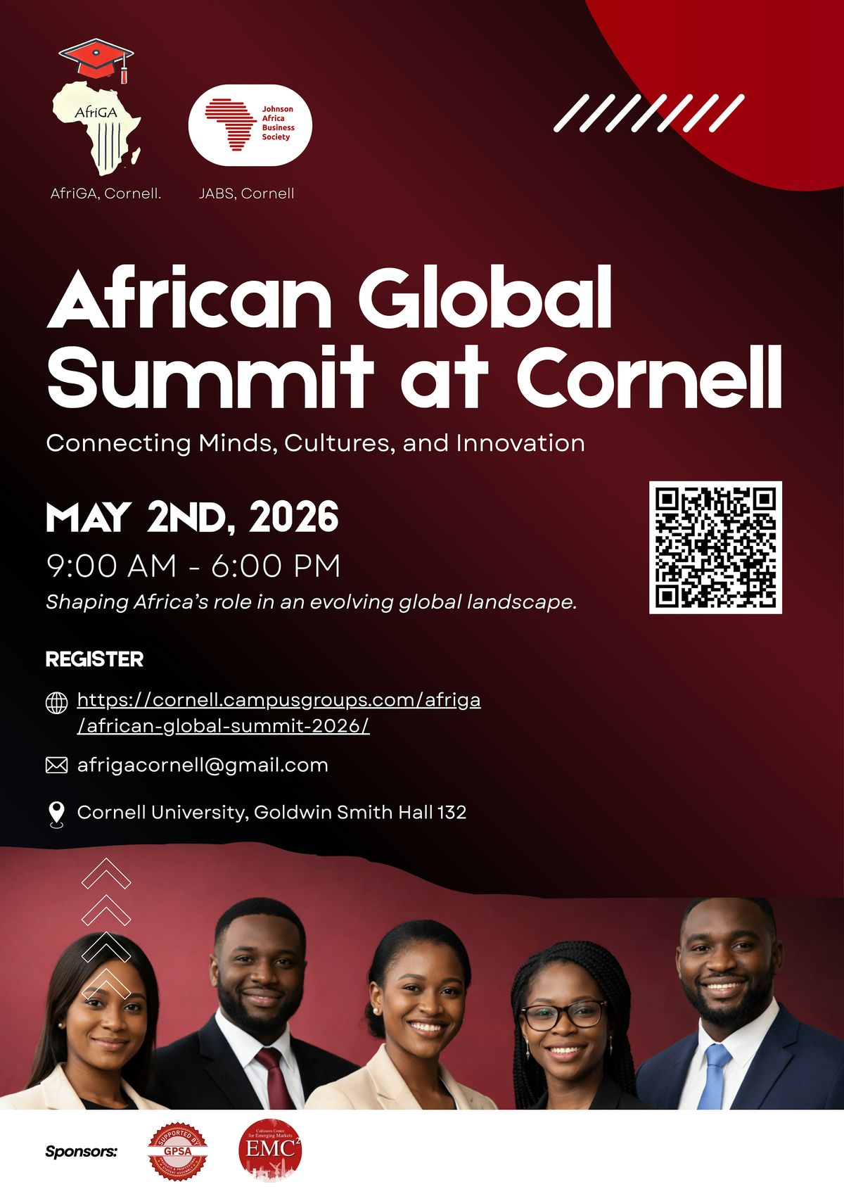 The African Global Summit at Cornell 2026 is a high-level convening exploring Africa’s evolving role in global leadership, innovation, capital systems, and institutional power. The Summit will bring together global leaders, entrepreneurs, policymakers, scholars, and graduate researchers for keynote conversations, panel discussions, and a graduate research showcase.