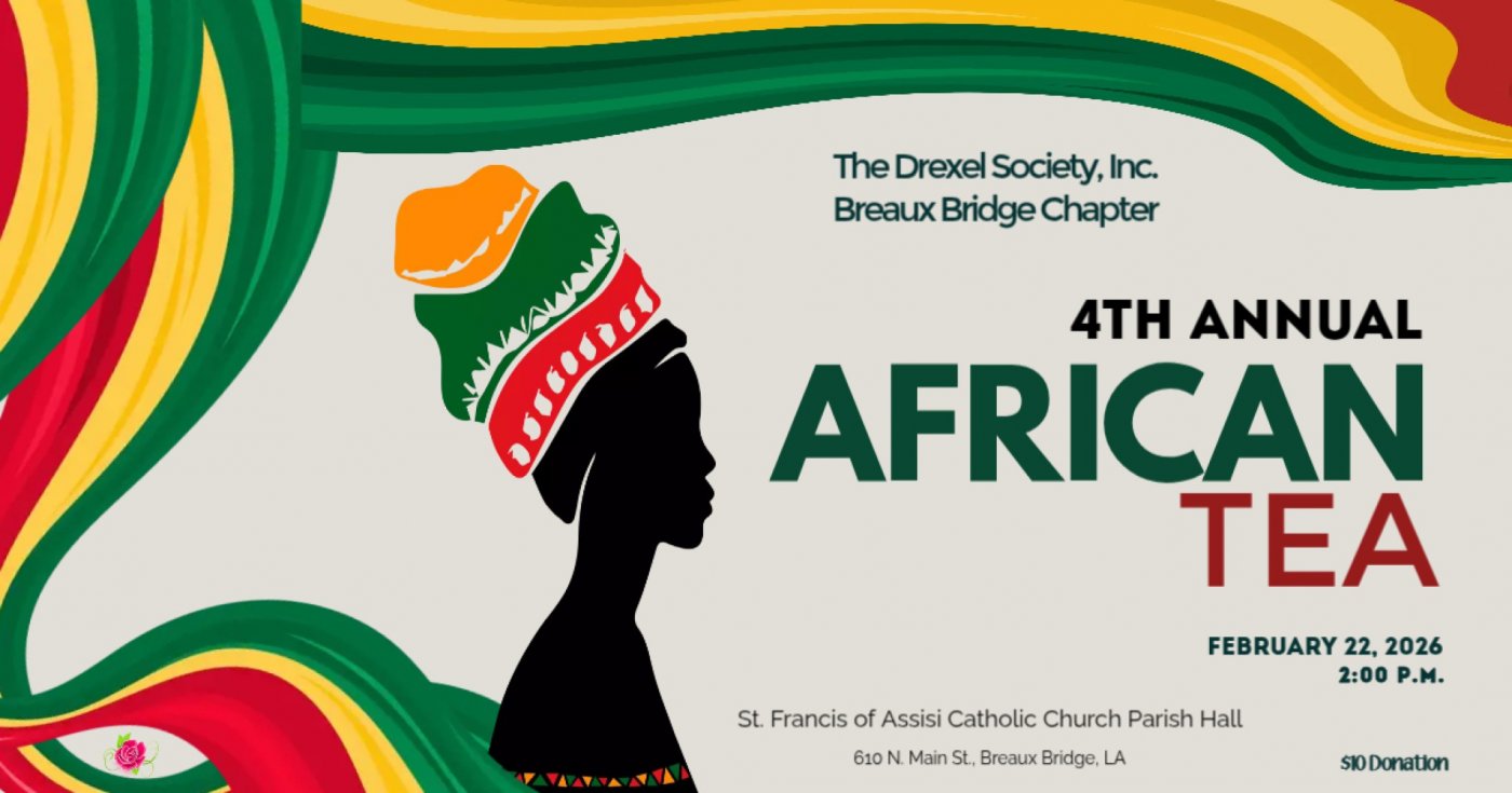 Join the Breaux Bridge Chapter of The Drexel Society for our 4th Annual African Tea on February 22nd at 2:00 PM.