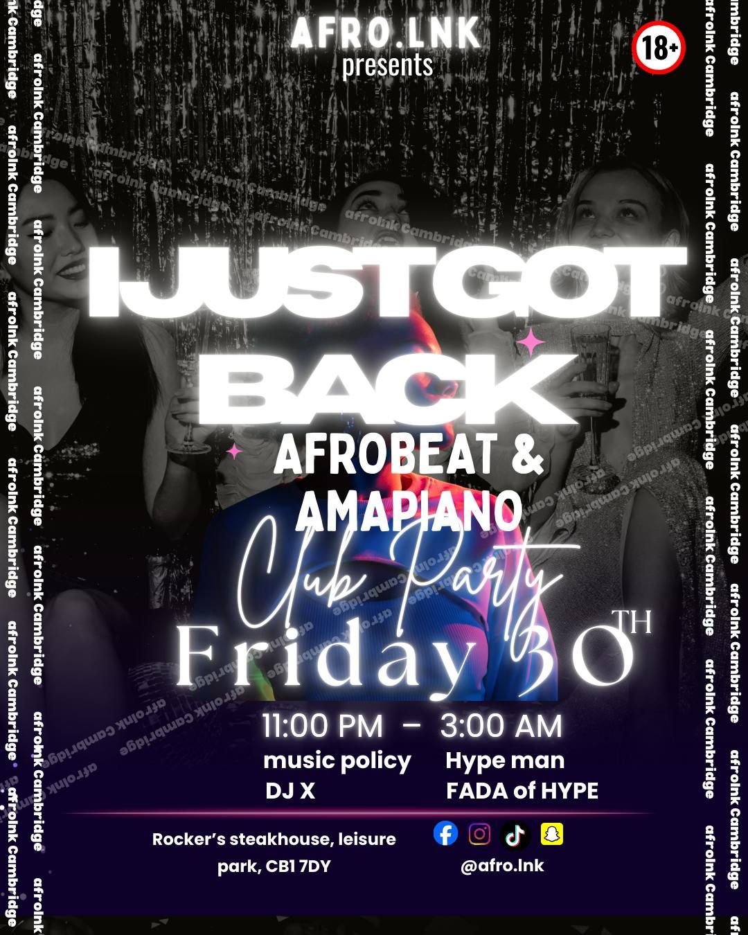 š Venue: Rockers Steak House,Ā Leisure Park, Cambridge, CB1 7DY.š Date: 30th Januaryš¶ Sounds: Afrobeats & Amapianoš Hosted by: Afro Lnk