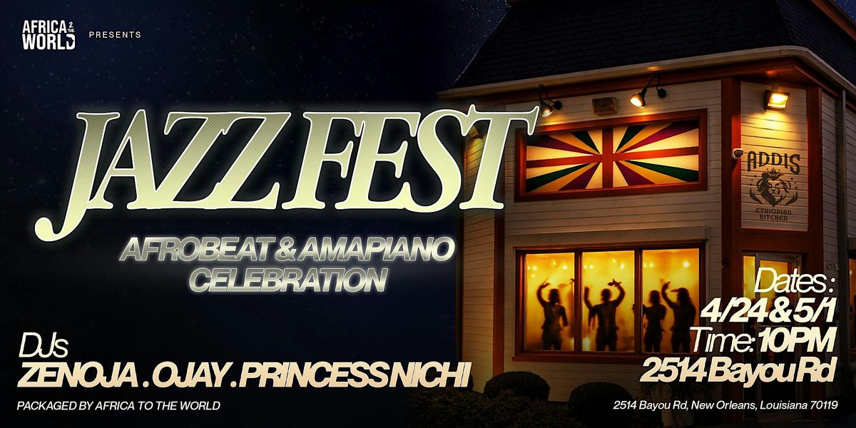 So many of you came out for our Mardi Gras Celebration we decided we need to come back for Jazz Fest!!! Whether you go to the festival or not, Africa 2 the World is hosting our 1st annual Jazz Fest Celebration across both festival weekends! We're back partnering with Michelin Guide featured, ADDIS NOLA. The party will be featuring Afrobeats & Amapiano DJ's Zenoja and DJ OJAY of Afrobeats NOLA