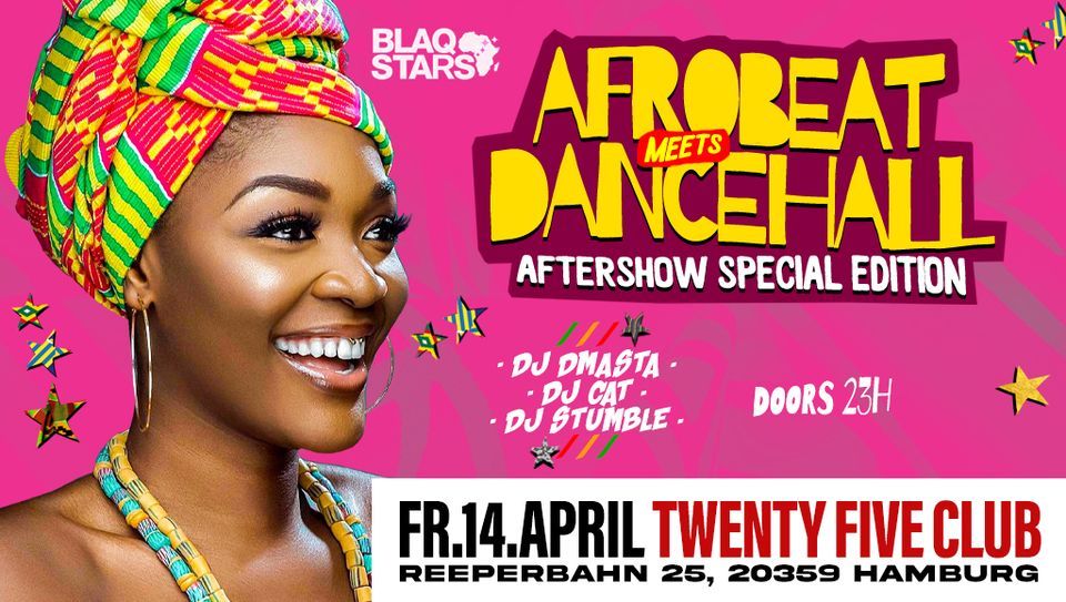 Join Blaqstars for the ultimate Afrobeats meets Dancehall experience at the TWENTY FIVE CLUB in Hamburg on Friday, April 14th, 2023. This event promises an unforgettable night of music, dance, and culture, featuring three talented DJs from around the world.DJ Dmasta will be flying in from Belgium to spin the hottest Dancehall tracks, while local hero DJ Stumble will bring his signature sound to the stage. And of course, no Afrobeats meets Dancehall event would be complete without the Afrobeats specialist DJ Cat, who will keep the party going all night long.Get ready to dance to the beats of the biggest Afrobeats and Dancehall artists such as Wizkid, Burna Boy, Vybz Kartel, and Popcaan. The TWENTY FIVE CLUB is the perfect venue for this incredible event, with its stunning sound and lighting systems and spacious dance floor.