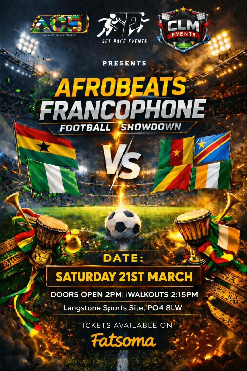 Set Pace Events, ACS Portsmouth, and CLM Events present the Afrobeats Vsย Francophone Football Showdown โ an exciting 11v11 football match bringing together culture, music and competition in Portsmouth.This event will see players representing Afrobeats and Francophone nations go head-to-head in a competitive football clash full of pride, energy and passion. ๐๐