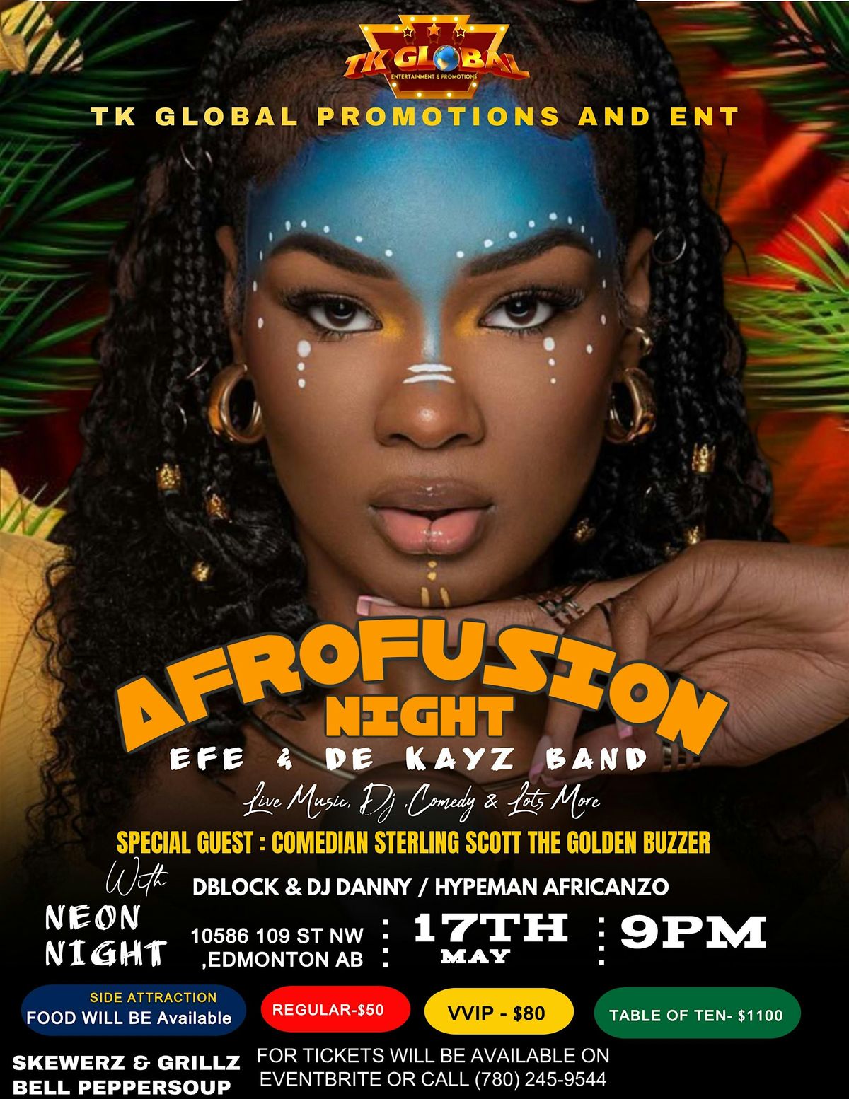 Afrofusion Night is a vibrant entertainment event in Edmonton hosted by TK Global Promotions, featuring live music, DJ sets, comedy, and high-energy performances. Headlined by Efe & De Kayz Band, the night also includes a special appearance by comedian Sterling Scott (Golden Buzzer), along with DJ Danny, DBlock, and hypeman Africanzo. Guests can enjoy a lively “Neon Night” atmosphere with food available from Skewerz & Grillz and Bell Peppersoup. The event takes place on May 17th at 9 PM at 10586 109 St NW. Book you table for 10 by calling (780) 245-9544.