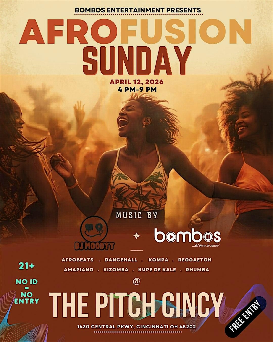 Come hang out at The Pitch Cincy on Sun, April 12th. Whether you're dancing or just soaking in the atmosphere, this in-person event is all about celebrating the rich and vibrant Afro and Caribbean cultures, fused with music from all over the world. Bring your friends, your dance moves, and your good vibes — we can't wait to see you there!