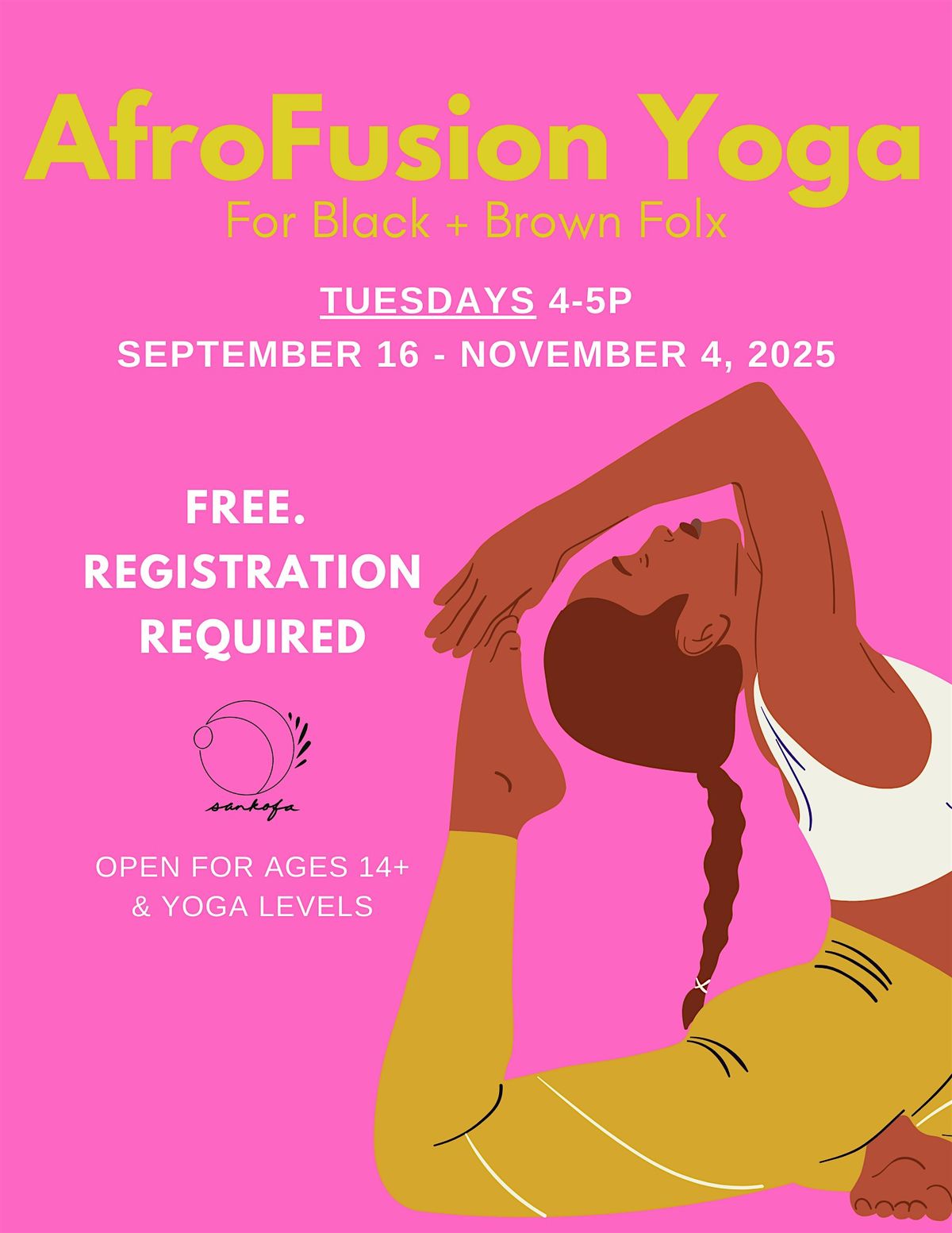 Join us for 8 weeks of AfroFusion Yoga! Dance, move, stretch, release in community. Whether you're a beginner or experienced, this event is open to all levels. Come and experience the joy of movement and connection.