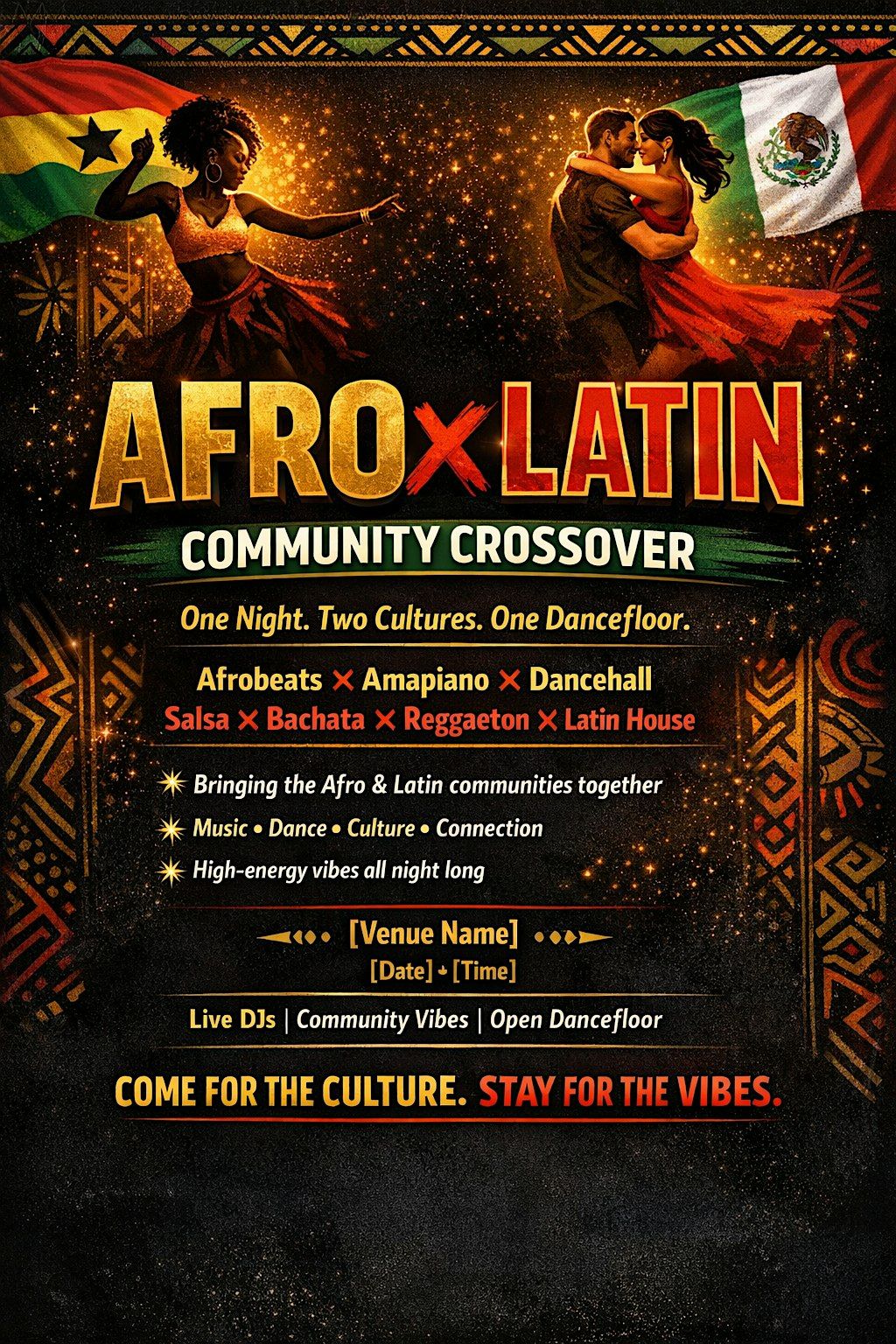 Get ready for an epic fusion of beats and moves at AFRO X LATIN - Community Crossover! This in-person event brings together the vibrant AfRO RHYTHMS and the colorful world of LATIN CULTURE for a night full of energy and fun. Come join the community, dance, laugh, and experience a unique cultural mashup that'll have you buzzing. Don't miss out on this awesome blend of music and vibes!