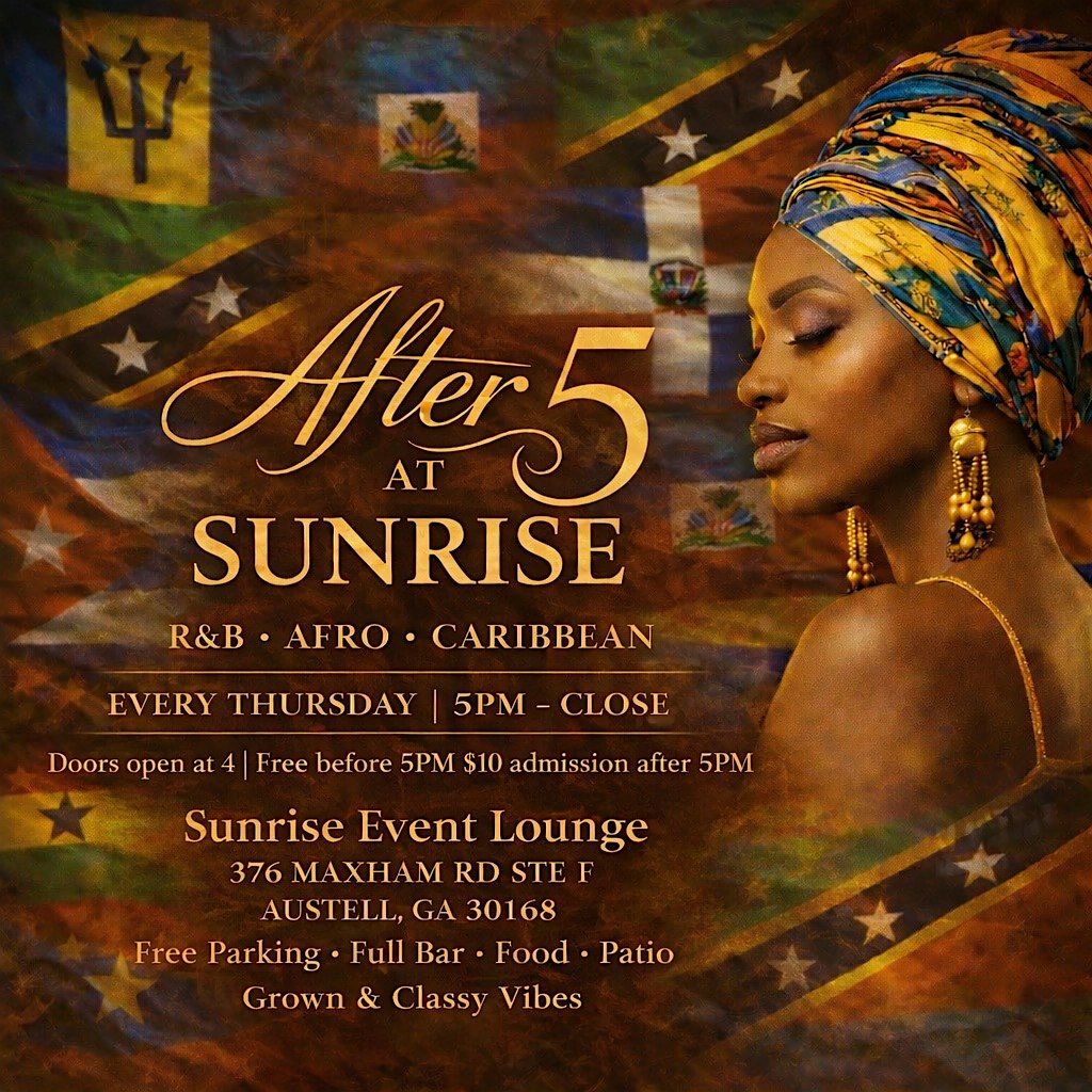After 5 at Sunrise is your go-to Thursday evening wind-down where grown, classy vibes meet great music, food, and conversation. Join us at Sunrise Event Lounge for a relaxed after-work experience featuring smooth R&B, Afro, and Caribbean sounds in a stylish, welcoming atmosphere.