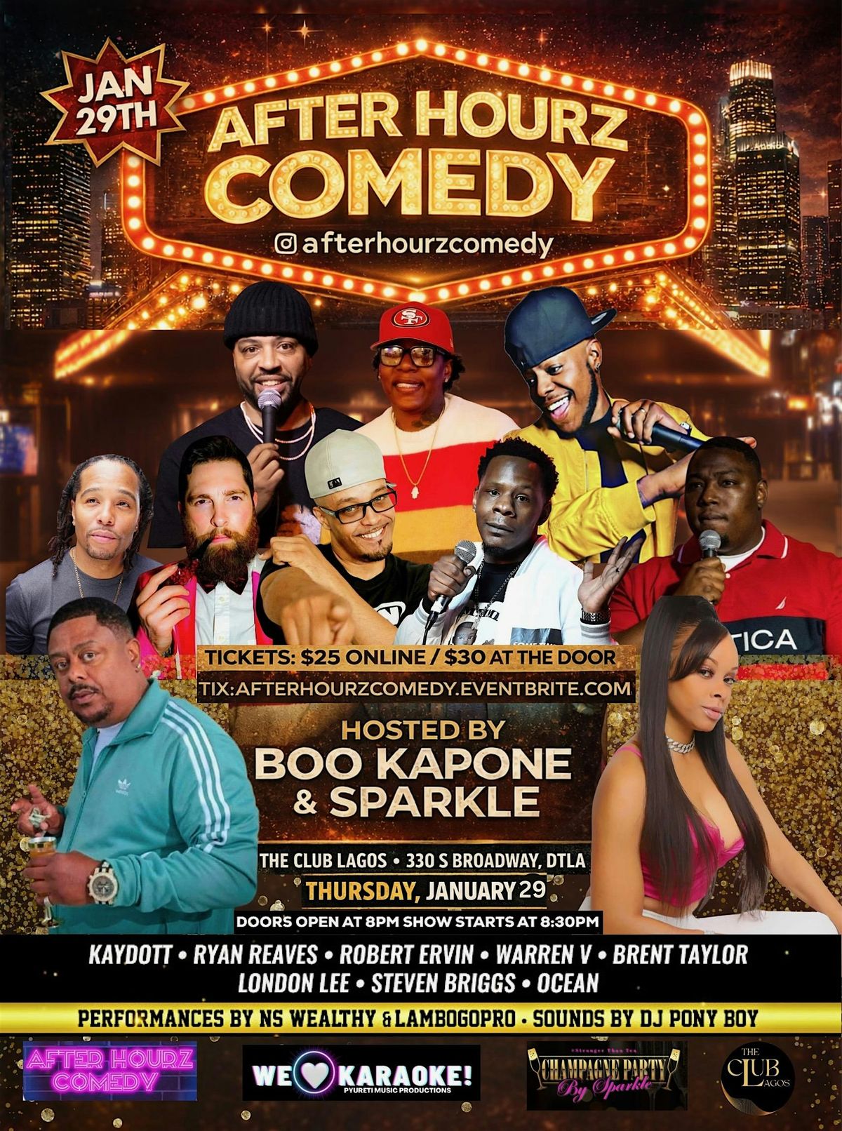Get ready for a full night of LA vibes — laughter, live music & karaoke energy all in one place! After Hourz Comedy is back with another unforgettable night featuring rising comedians, surprise guests, and a post-show after party that turns into a concert-style karaoke experience. It’s more than a show… it’s an EXPERIENCE.Sounds Kid Pony Boy