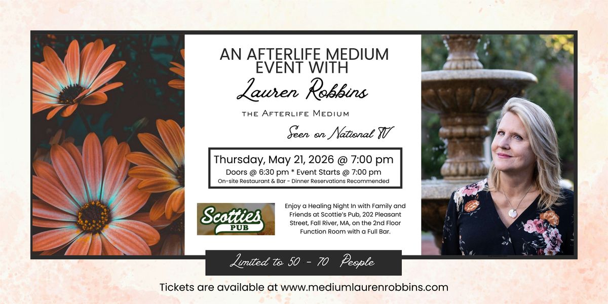 Limited to 50-70 people, tickets are priced based on the number of attendees and are non-refundable or non-transferable to another date. If you are unable to attend, a friend or family member may check in under your name. No one under 18 years of age allowed. This event is held at Scottie's Pub, 202 Pleasant Street in Fall River, MA. Enjoy dinner before the show. Doors open at 6:30 pm for check-in. The event begins at 7:00 pm and runs between 1.5 and 2 hours, depending on the total number of attendees. Contact Lauren's office at 781-373-8017 with ticket questions at least 24 hours before the event, or visit her website to view her services, groups, and events at www.mediumlaurenrobbins.com