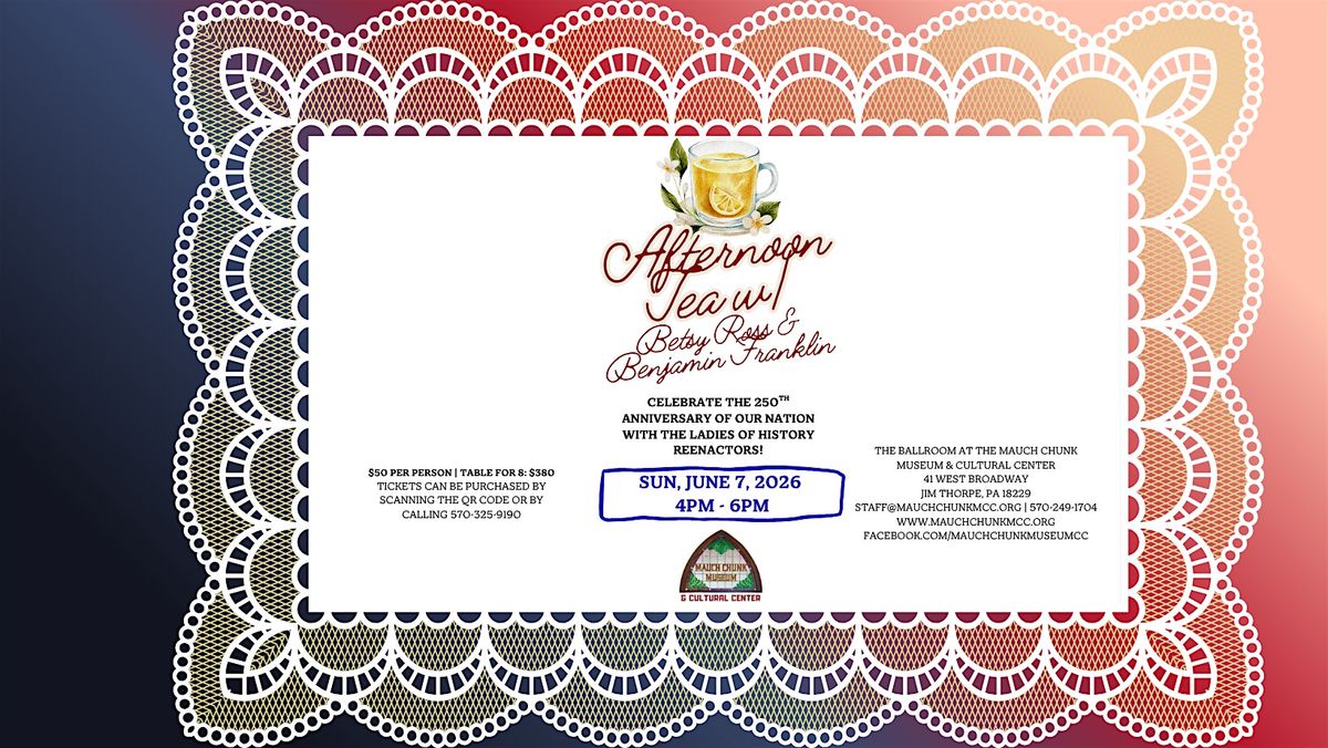 The Mauch Chunk Museum & Cultural Center presents “Afternoon Tea with Betsy Ross and Benjamin Franklin”! This event will take place on Sunday, June 7, 2026 from 4pm to 6pm in The Ballroom at the Mauch Chunk Museum & Cultural Center.