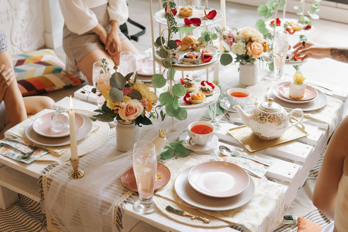 Guests will be seated in a luxury picnic set-up surrounded by comfortable pillows and rugs. Each picnic set-up includes beautiful decor including fresh floral centerpieces and plating. Tables can seat a max of 6 guests. Our Afternoon Tea menu will be served on our beautiful floral 3-tiered cake stands. If weather permits, some tables will be offered outside on our private patio with patio umbrellas. There are a total of 5 tables per 1.5hr time slot.