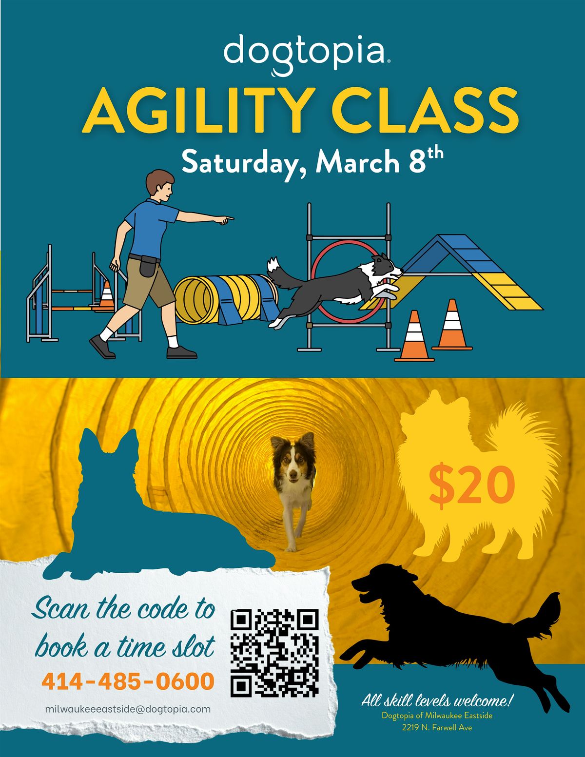 Join our fun-filled Agility Class at Dogtopia Milwaukee East Side! It's a great way to bond with your pup while they tackle tunnels, jumps, and weave poles. Whether a beginner or pro, this class is perfect for all skill levels.