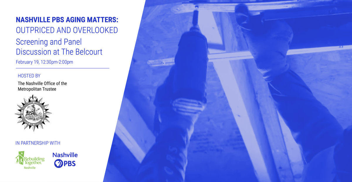 Nashville Trustee's Office, in partnership with Nashville PBS and Rebuilding Together Nashville, will be hosting a screening of Aging Matters: Outpriced & Overlooked, an installment in the PBS Aging Matters series, at Belcourt Theatre followed by a panel discussion with leaders in Nashville affordable housing and a lightly catered reception. This is a free event open to the public and anyone interested in learning more about affordable housing for older adults in Nashville!