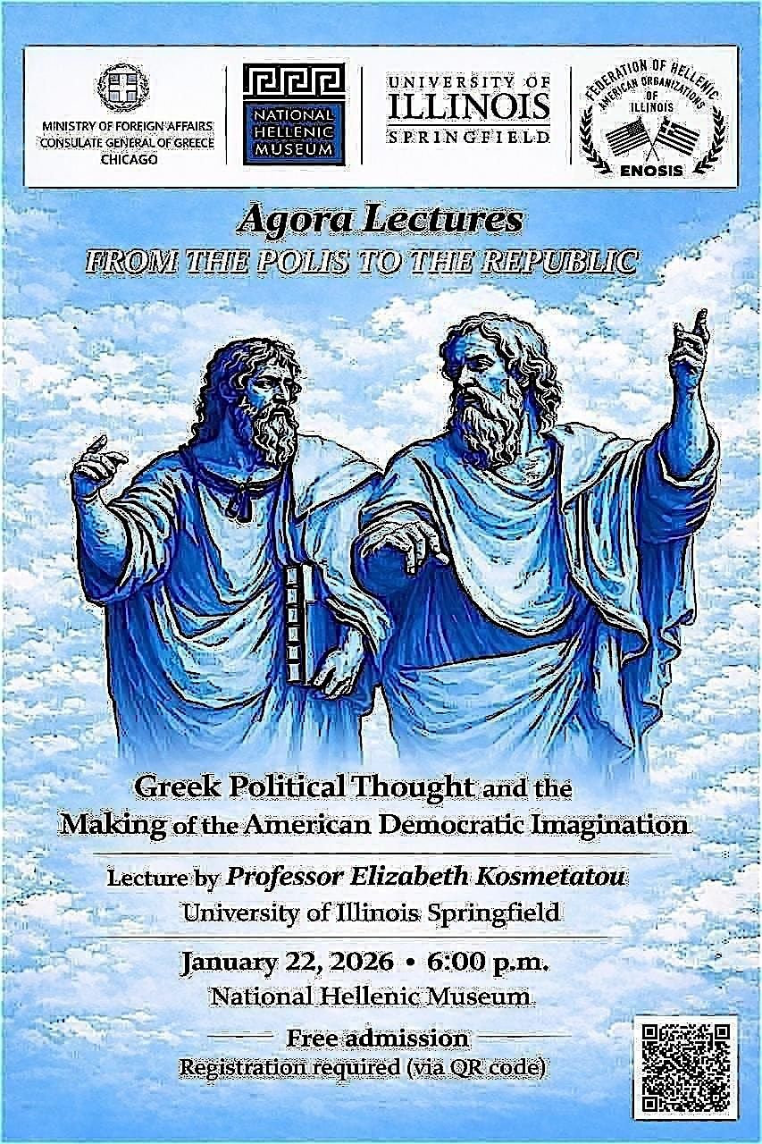 The lecture titled “From the Polis to the Republic: Greek Political Thought and the Making of the American Democratic Imagination” will be presented by Professor Elizabeth Kosmetatou of the University of Illinois Springfield. It will take place on January 22, 2026, at 6:00 p.m. at the National Hellenic Museum. The event is organized by the Consulate General of Greece in Chicago, in cooperation with the National Hellenic Museum, the University of Illinois Springfield, and the Federation of Hellenic American Organizations of Illinois (ENOSIS).