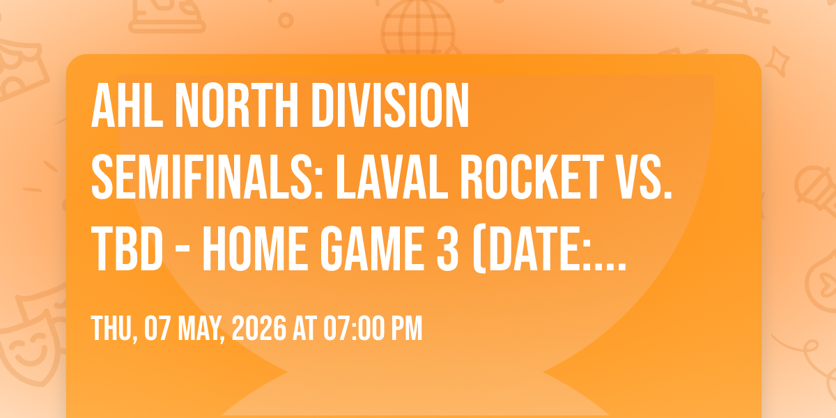 🎉 Welcome to AHL North Division Semifinals: Laval Rocket vs. TBD - Home Game 3 (Date: TBD - If Necessary), where the impossible becomes possible and dreams take flight! 🏛️ Join us at Place Bell in the heart of Laval, QC for an event that will redefine your expectations. 📅 On May 7th, 2026 at 07:00 PM, witness the transformation of space and time into something truly magical. ✨ It's a curated experience combining the best of innovation, entertainment, and community spirit, creating moments that will be remembered for years to come. Whether you're a first-time visitor or a seasoned enthusiast, prepare to be amazed. 🎊 Book now to ensure your place in this unforgettable experience!http://maps.seatics.com/PlaceBell_Hockey_2017-03-24_2017-03-24_1300_SVGC_tn.gif