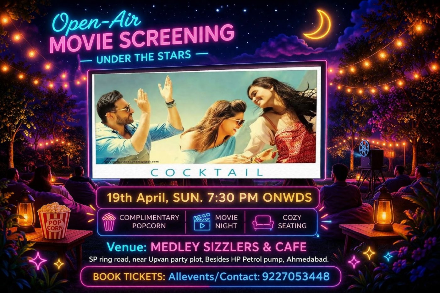 Experience the magic of Bollywood under the stars at our enchanting Open-Air Movie Screening of COCKTAIL! ๐ฅโจ at MEDLEY SIZZLERS & CAFE.