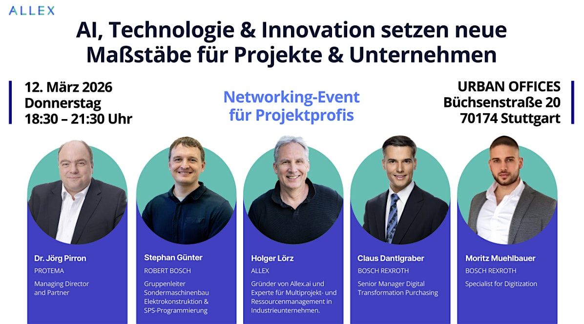 AI und Technologie setzen gerade neue Standards für Projektarbeit in der Industrie. Genau darüber sprechen wir bei unserem exklusiven Allex.ai Networking-Event in Stuttgart.