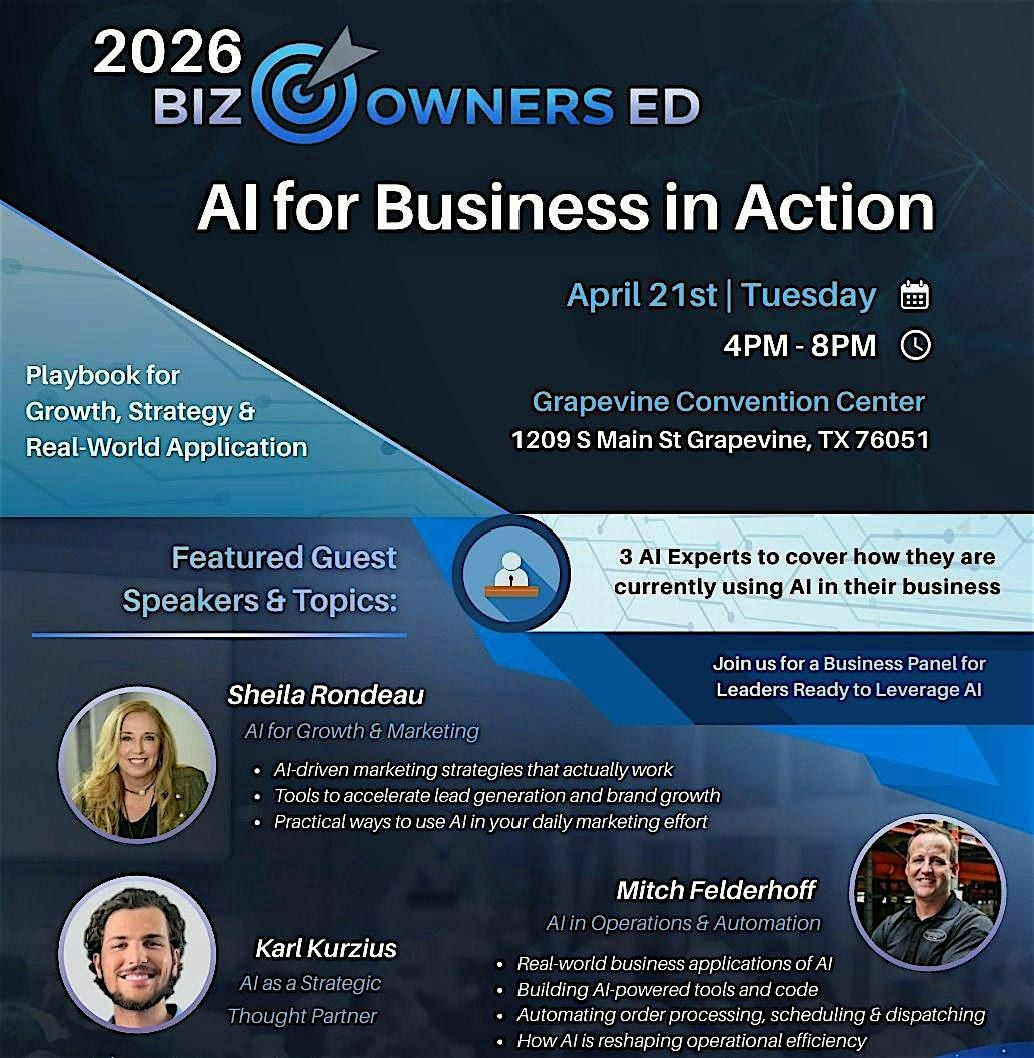 We’re excited to invite you to AI for Business in Action, hosted by BIZ, on Tuesday, April 21st from 4:00–8:00 PM at the Grapevine Convention Center.