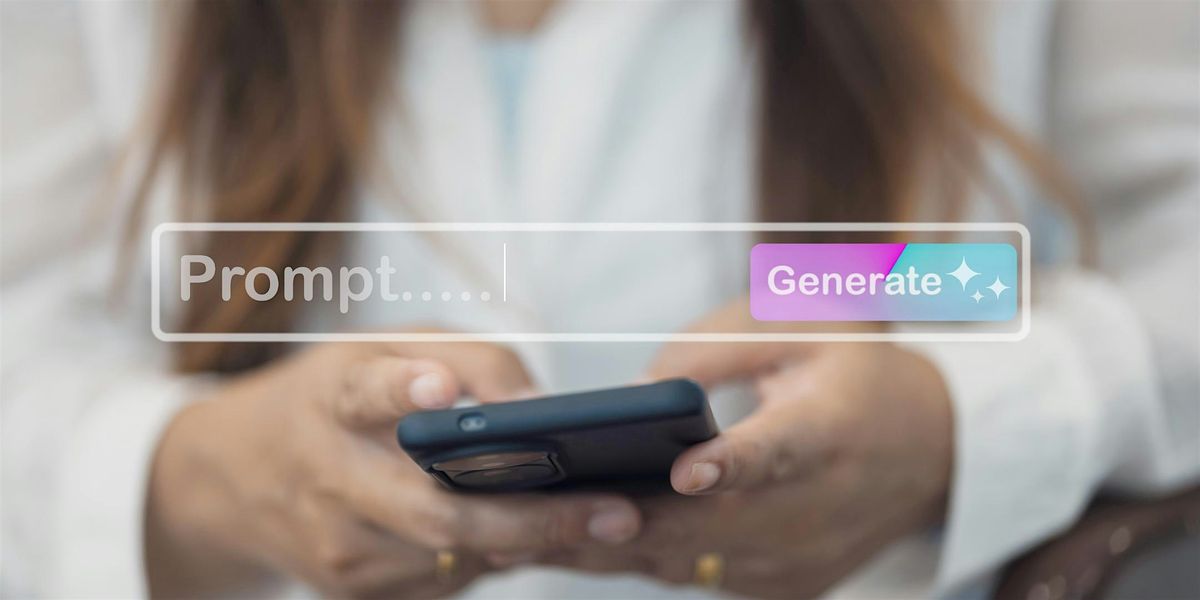 Image: A person holding a smartphone, overlaid by a text box which says Prompt..... Generate.