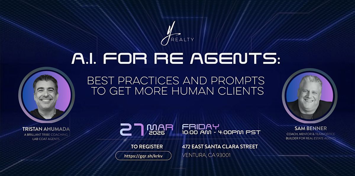 Welcome to the event A.I for RE Agents: Best Practices and Prompts to Get More Human Clients! Join us at 472 E Santa Clara St on March 27, 2025 at 10:00 AM (Pacific Time). Learn how artificial intelligence can enhance your real estate business and attract more clients. Don't miss out on this opportunity to stay ahead in the industry! See you there!
