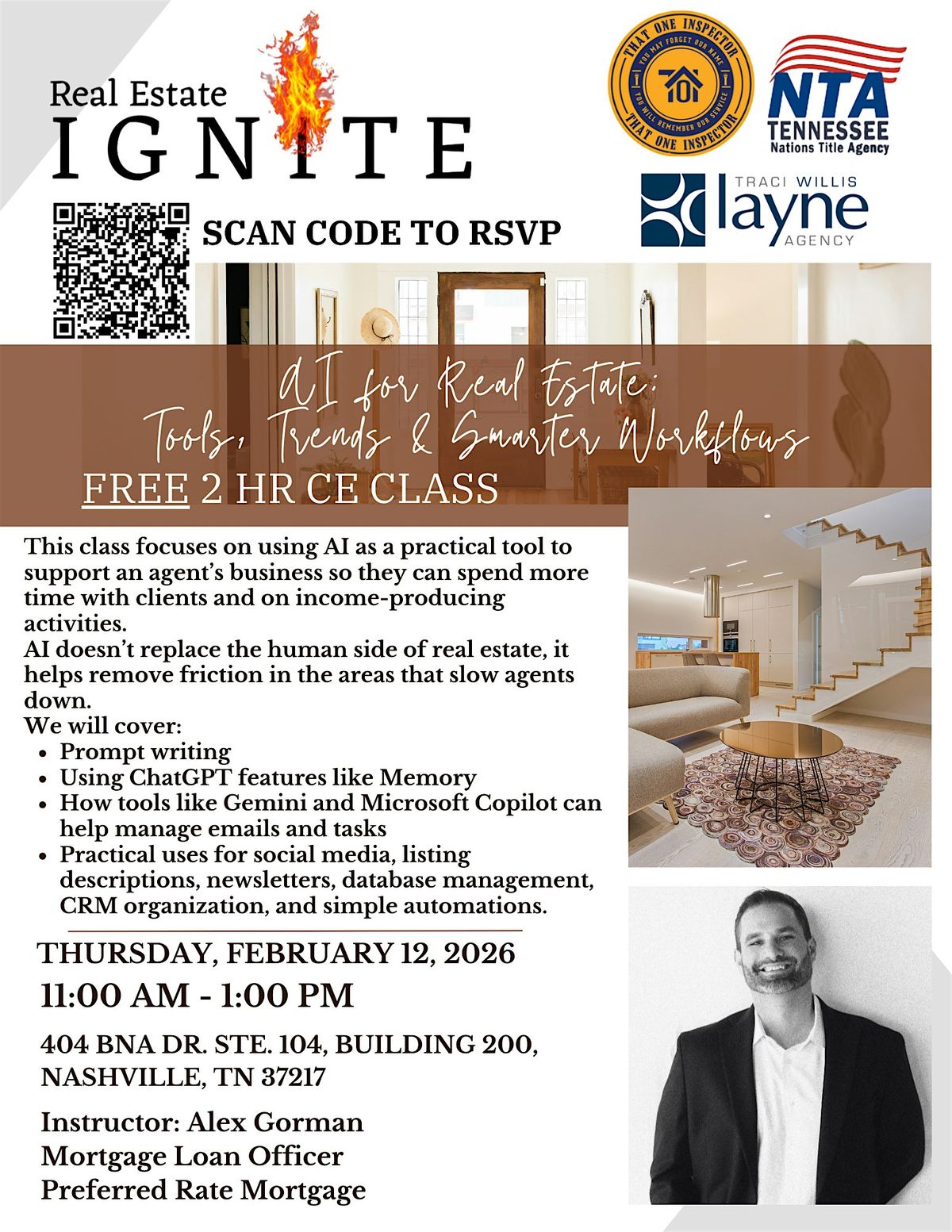 Join us for a free 2-hour CE class for REALTORS®: AI for Real Estate: Tools, Trends & Smarter Workflows taught by Alex Gorman with Preferred Rate Mortgage. This class focuses on using AI as a practical tool to support an agent’s business so they can spend more time with clients and on income-producing activities. AI doesn’t replace the human side of real estate, it helps remove friction in the areas that slow agents down.
