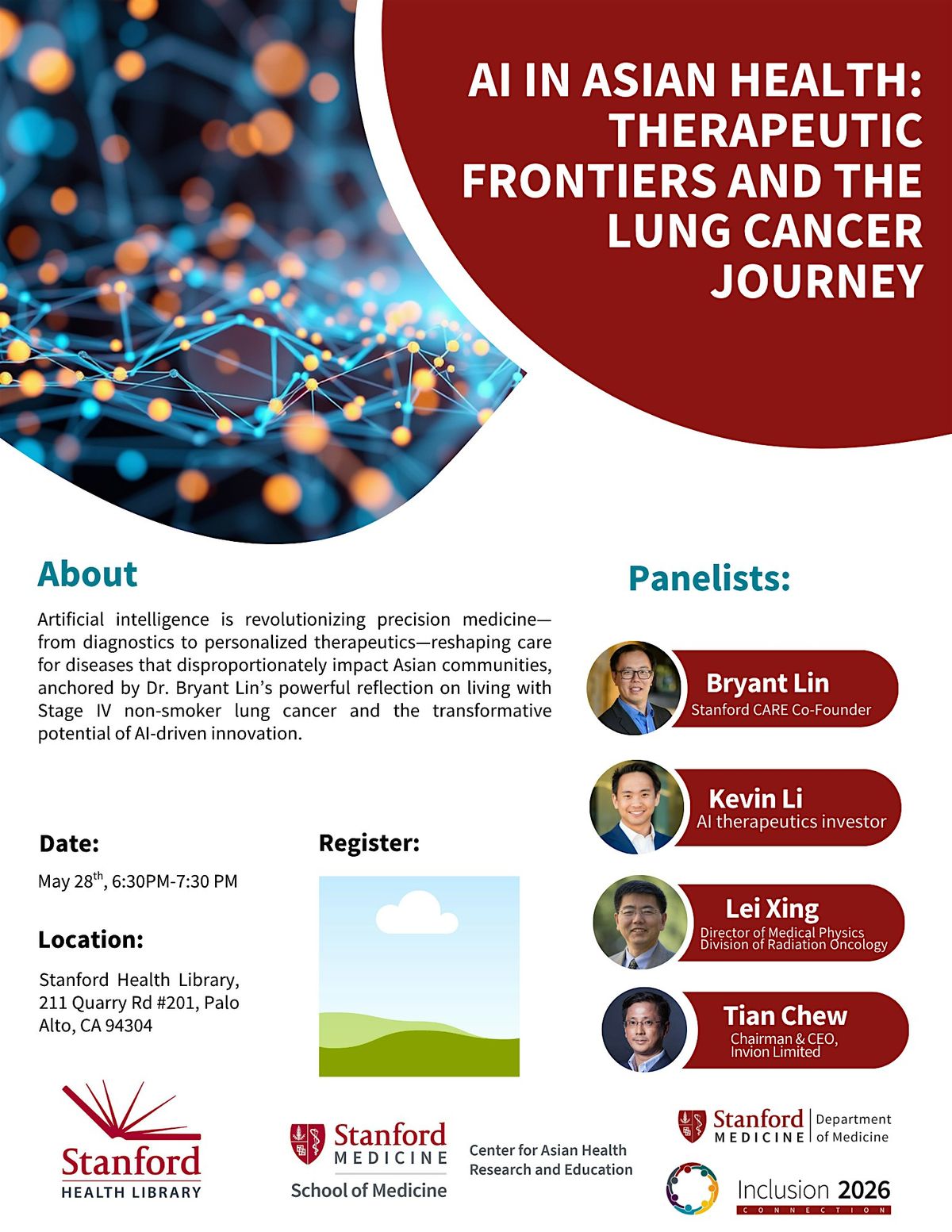 This event will explore how artificial intelligence is transforming precision medicine—from diagnostics to therapeutics—with a focus on diseases that disproportionately affect Asian populations. The program will open with a reflection by Dr. Bryant Lin, Co-Founder of the Stanford Center for Asian Health Research and Education (CARE), on his personal journey with Stage IV non-smoker lung cancer, as shared in his forthcoming book Sunshine: An Exploration of Living When You Are Dying. His story will serve as the foundation for a broader discussion on AI-driven innovation in early detection, personalized therapeutics, and equitable care.