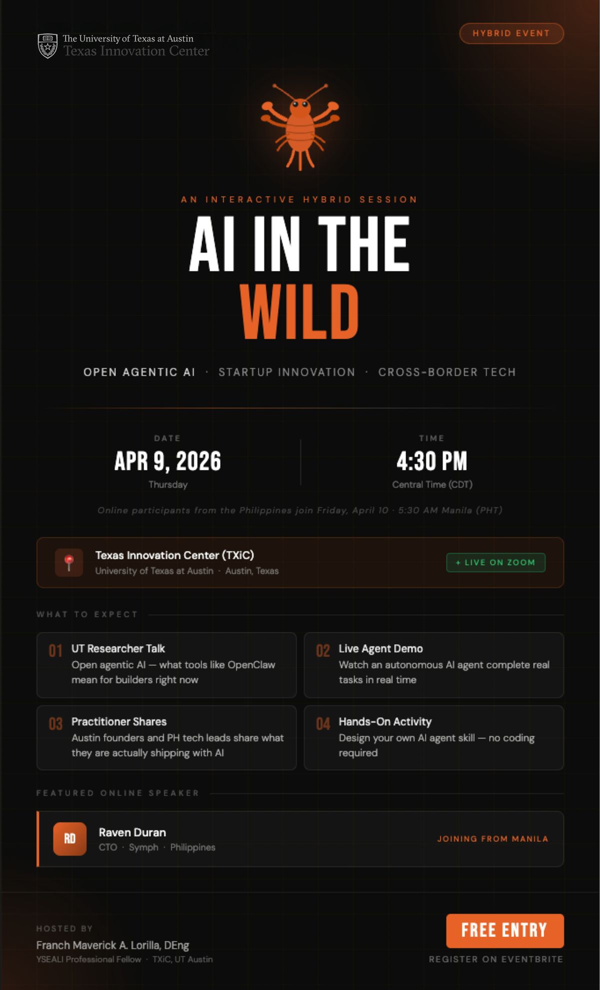 This event is hybrid. Austin attendees join in person at TXiC. Participants from the Philippines and Southeast Asia join live on Zoom.