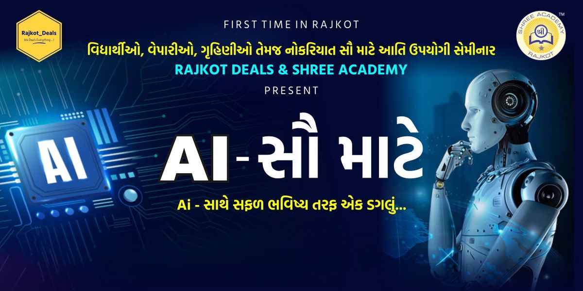 Rajkot Deals and Shree Academy have brought you a seminar called AI for All. In which you will be able to know all the information about AI, such as what AI is, how AI works, and how AI can be useful for you. At the end of this seminar, you will be able to ask any question related to AI. This seminar will be very useful for students, housewives, businessmen and anyone who wants to earn money through AI or wants to make their life successful through AI.